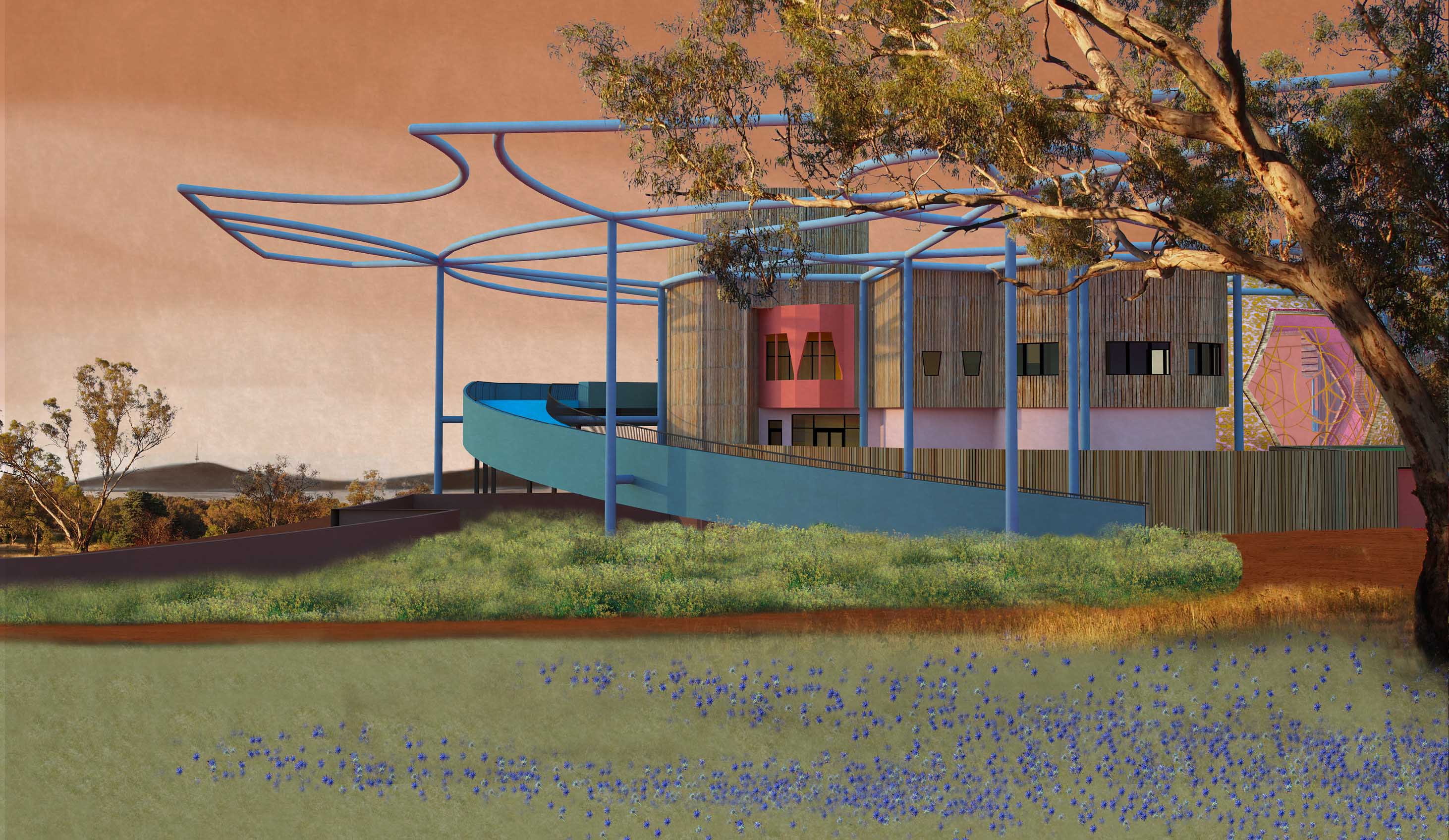 The project translates Griffin and Mahoney’s proposed apparition amongst the gums. From the street an attempt has been made at continuing the exuberance of scale that has crept in to the buildings lining the shores of Lake Burley-Griffin & Mahoney, whilst continuing the existing amenity of Canberra: up close always a side of beef but from a far a city of cities. A blue mist envisages Canberra as a ‘new’ Venice for the East. The architecture is an argument for bush diplomacy.