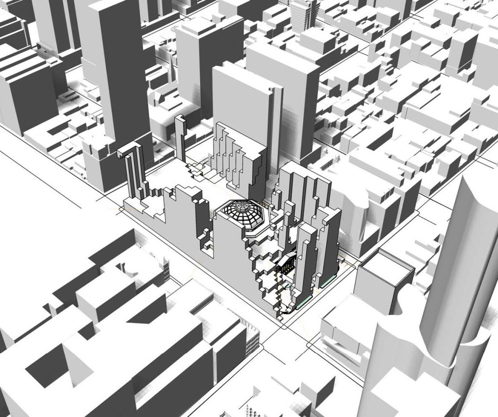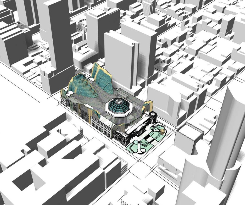The project presents two distinct conditions. The exterior is like a fortress, an acropolis, a temple to the library and its incoming institutions. It frames and exaggerates the dome, portico, and fortified language of the existing architecture. It reflects and draws on the language of the surrounding city, creating a new experience of the library as both artefact and stage. The interior is a displacement of the known; objects that depart from the existing SLV language house these new programs.