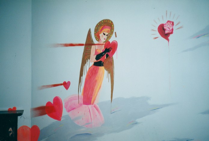 “I commissioned him to do a mural on the wall of my new-born son’s bedroom. In the flurry of the activity that surrounded the birth, I took little notice of Rob working away behind the closed door. Eventually, the big shot was installed in his room, and I examined the mural. It consisted of a series of plump winged Giotto type cherubs, a favourite motif, acting as solemn custodians high upon the walls, hovering amongst a flotilla of pastel and gold smeared clouds. Then I noticed another lone smiling angel, something of an outsider, she hovered on the wall below the mantlepiece, wearing diamanté glasses and a black leather brassiere over a pink satin sheath with a flared taffeta hem. I expect Rob is elsewhere laughing with that very angel” [1]